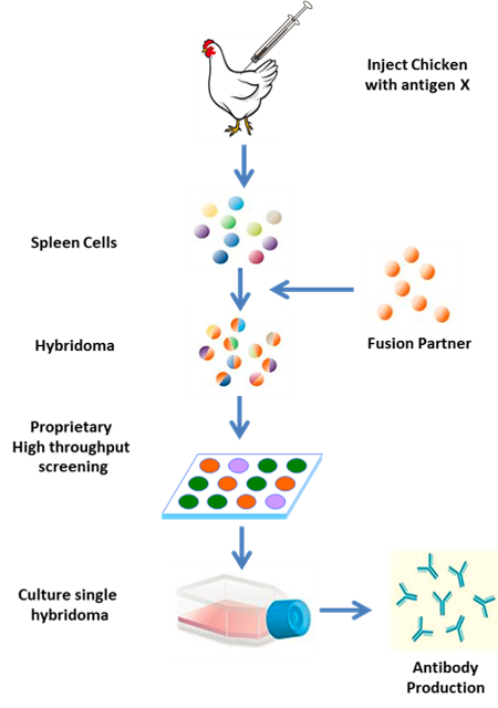 Somru is currently developing a unique and proprietary method for making monoclonal antibodies using a chicken model rather than the conventional method of starting with mice. Chicken hybridomas are produced using the B-cells from immunized chickens and a fusion partner. Hybridomas are then screened to select for clones with specific and sensitive antigen recognition and the antibodies are characterized using a variety of methods.